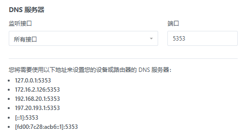 3)DNS 服务器,选择 监听接口 和绑定 端口。