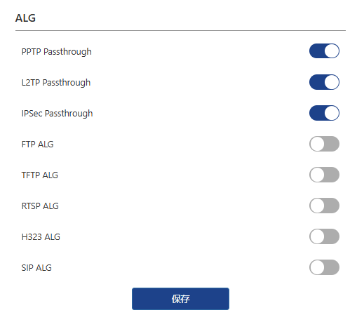 ALG(Application Layer Gateway)允许将自定义的NAT遍历过滤器插入网关,以支持某些应用层“控制/数据”协议(如 FTP、TFTP、H323 等)的地址和端口转换。建议保留默认设置。当您使用语音和视频应用程序通过路由器创建和接受呼叫时,您可能需要禁用 SIP ALG,因为某些语音和视频通信应用程序无法很好地与 SIP ALG 配合使用。