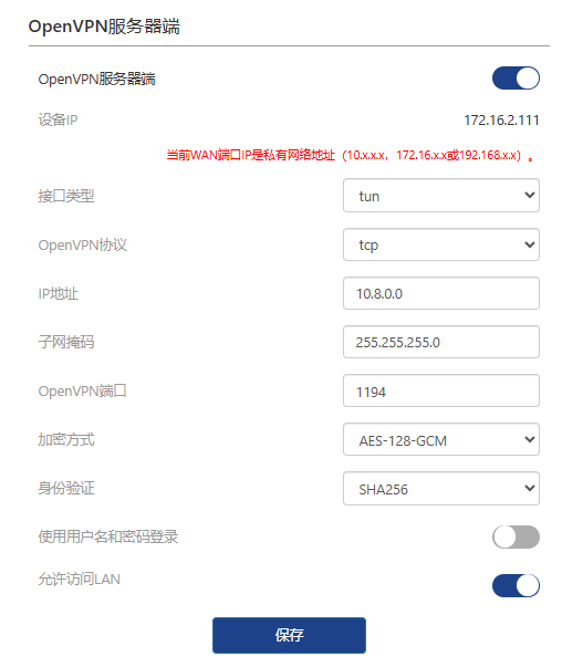 点击 导出配置文件 保存OpenVPN配置文件,VPN客户端设备将使用该文件来建立VPN连接。