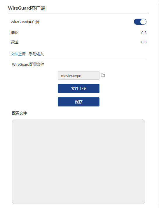 导入VPN提供商提供的 WireGuard配置文件,然后点击 文件上传。或 选择 手动输入,填写WireGuard VPN的配置参数。