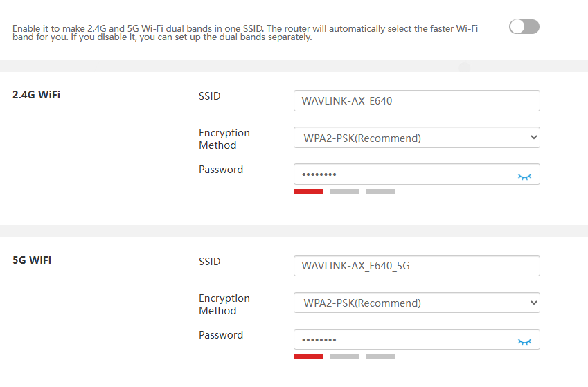 When enabled Band Steering, both 2.4GHz and 5GHz wireless networks share the same Wi-Fi name. The router will dynamically assign devices to the optimal frequency band based on real-time network conditions. When disabled, you may configure separate Wi-Fi names and settings for the 2.4GHz and 5GHz bands.