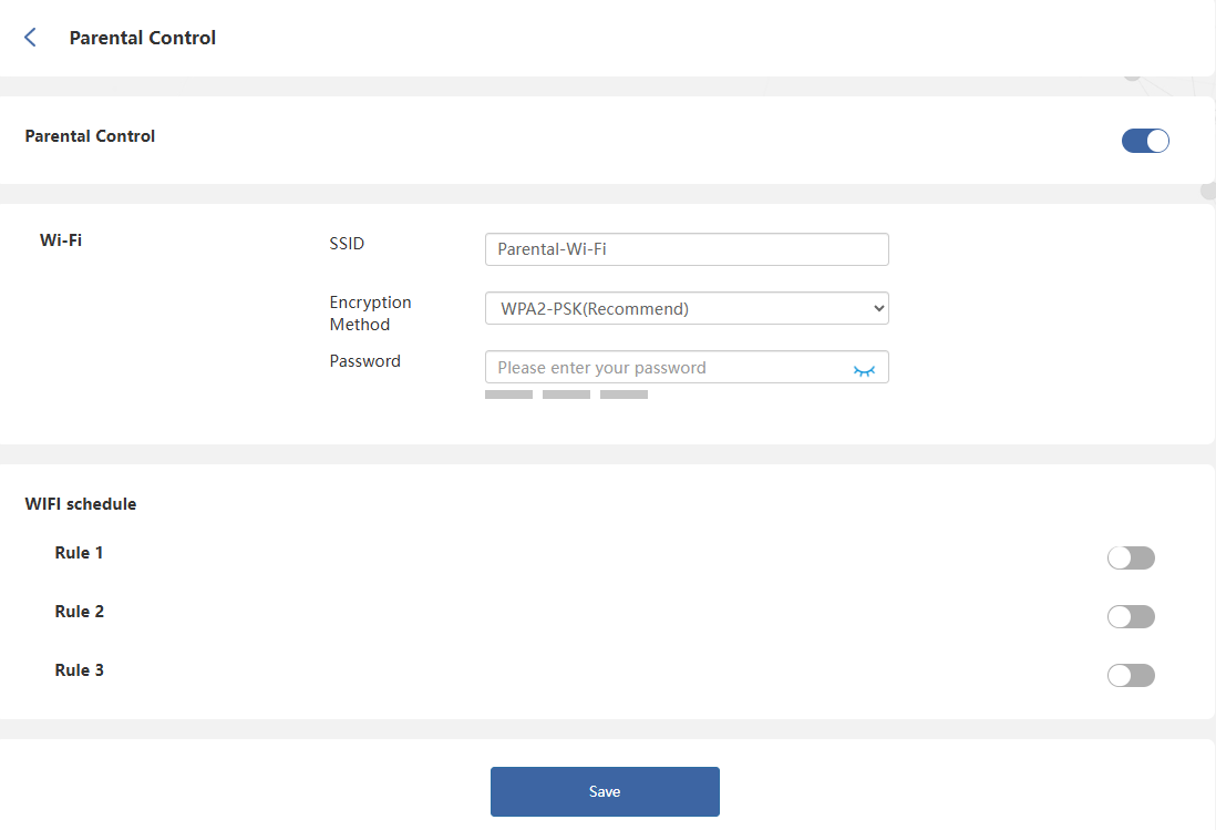 Parental Wi-Fi allows you to set up a separate wireless network for family members. You can configure its SSID, encryption method, and rules.