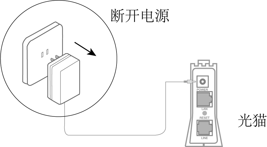 - 拔出您的DSL调制解调器(光猫)电源适配器。如果光猫有备用电池,请移除电池。