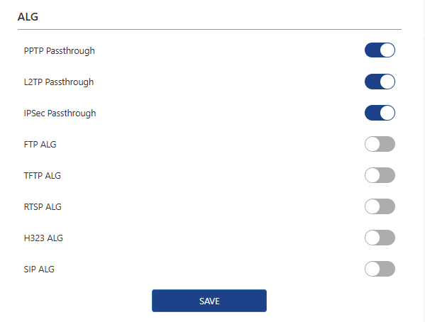 ALG(Application Layer Gateway)allows a custom NAT traversal filter to be inserted into the gateway to support the address and port translation of certain application layer “control/data” protocols. Keeping default settings is recommended. When you use voice and video applications to create or receive calls through the router, you may need to disable SIP ALG because some voice and video applications do not work well with SIP ALG.