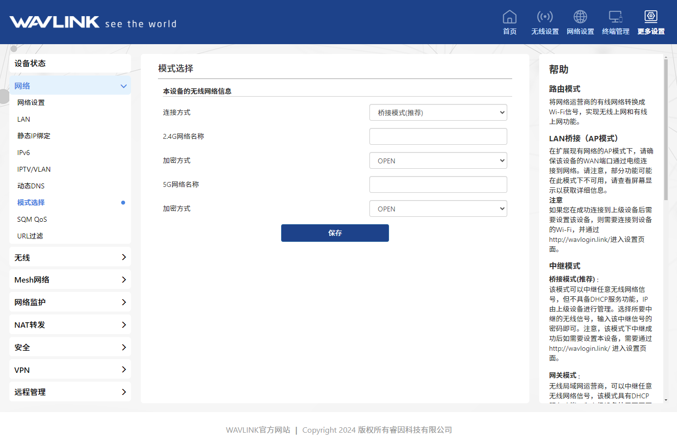 - 选择产品的连接方式、2.4G和5G网络名称、合适的加密方式和密码后,点击保存