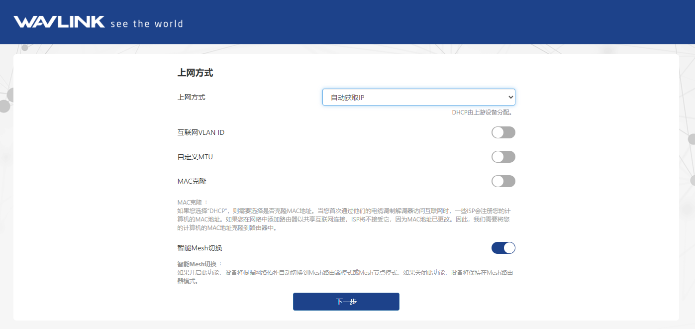 4)登录后, 选择合适的上网方式,点击 下一步。