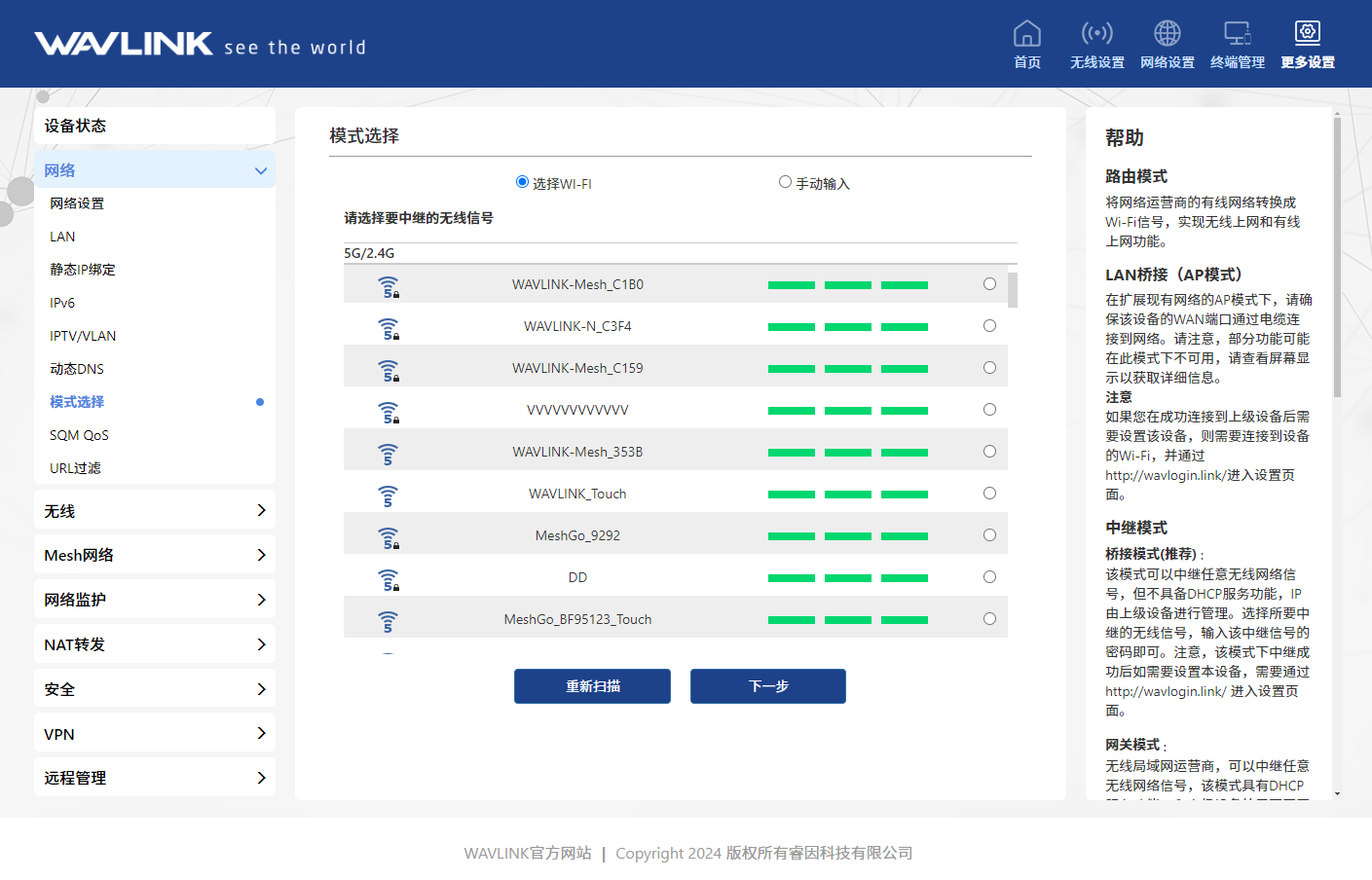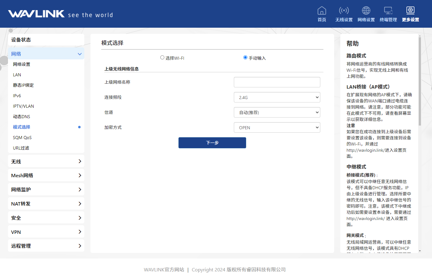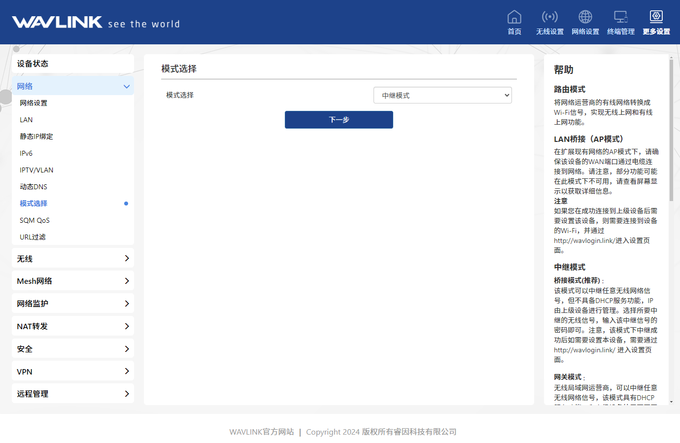 - 选择 更多设置>网络>模式选择, 模式选择列中选择 中继模式,单击下一步。