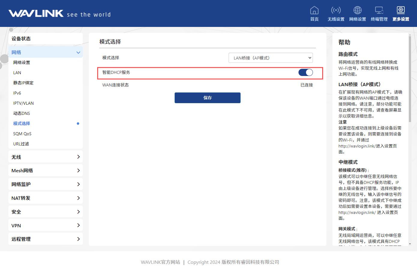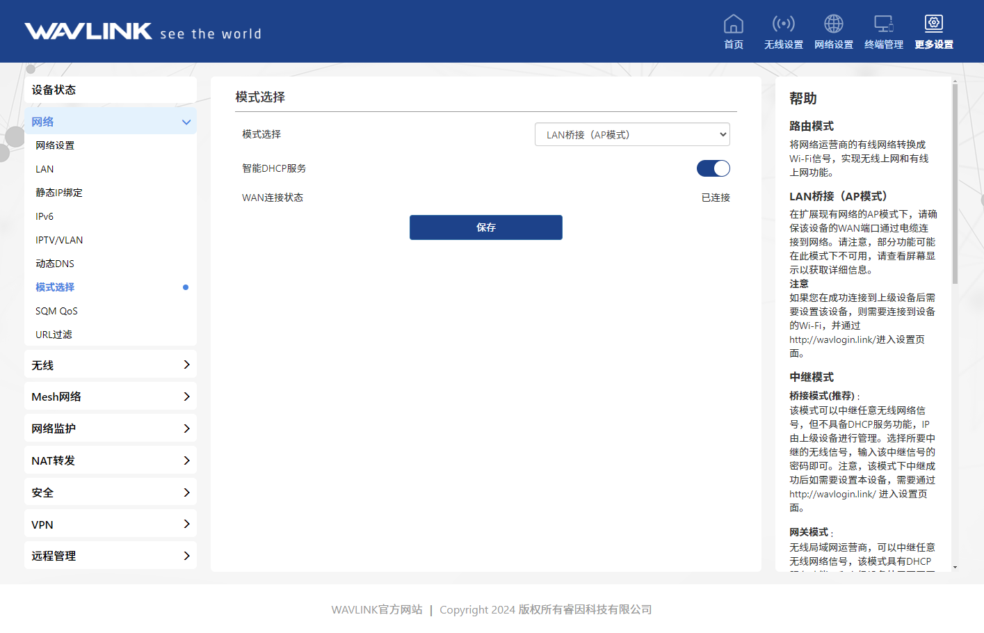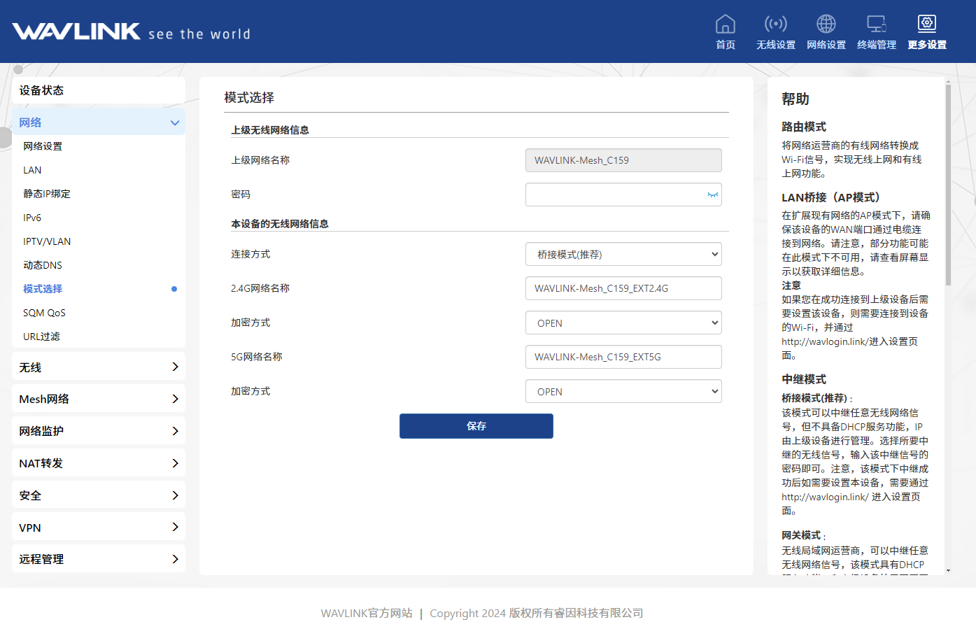 - 选择 更多设置>网络>模式选择, 模式选择列中选择 中继模式,单击下一步。