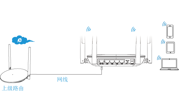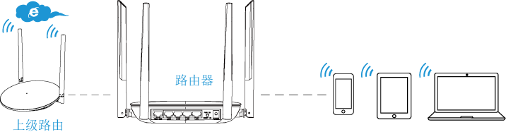 - 中继模式时,该路由器以无线的形式连接上级路由和上网设备以扩大WiFi信号覆盖范围。若需要将路由器设置为中继模式请将产品置于上级路由信号范围内,然后参考以下步骤进行设置: