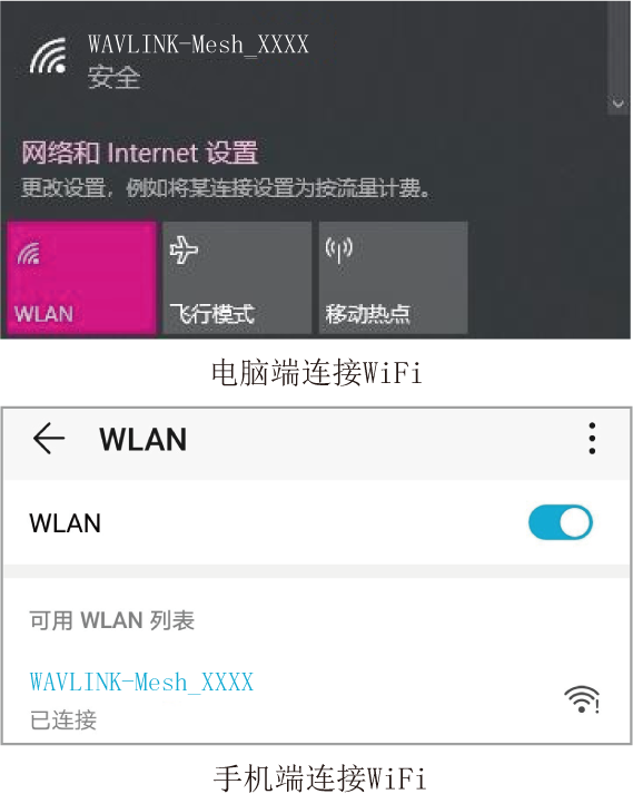 2)无线:使用笔记本(或手机)连接到无线路由器后侧表上注明的默认网络名称(SSID)--WAVLINK_Mesh_XXXX。