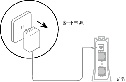 1)拔出您的DSL调制解调器(光猫)电源适配器。如果光猫有备用电池,请移除电池。