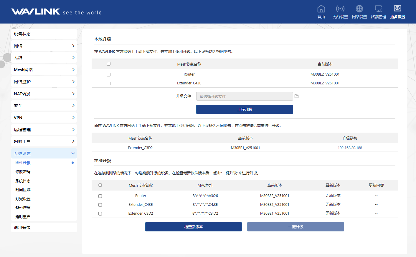 WAVLINK设备为您提供了两种固件升级方式:本地升级和在线升级。您可以选择其中一个作为合适的升级方法。