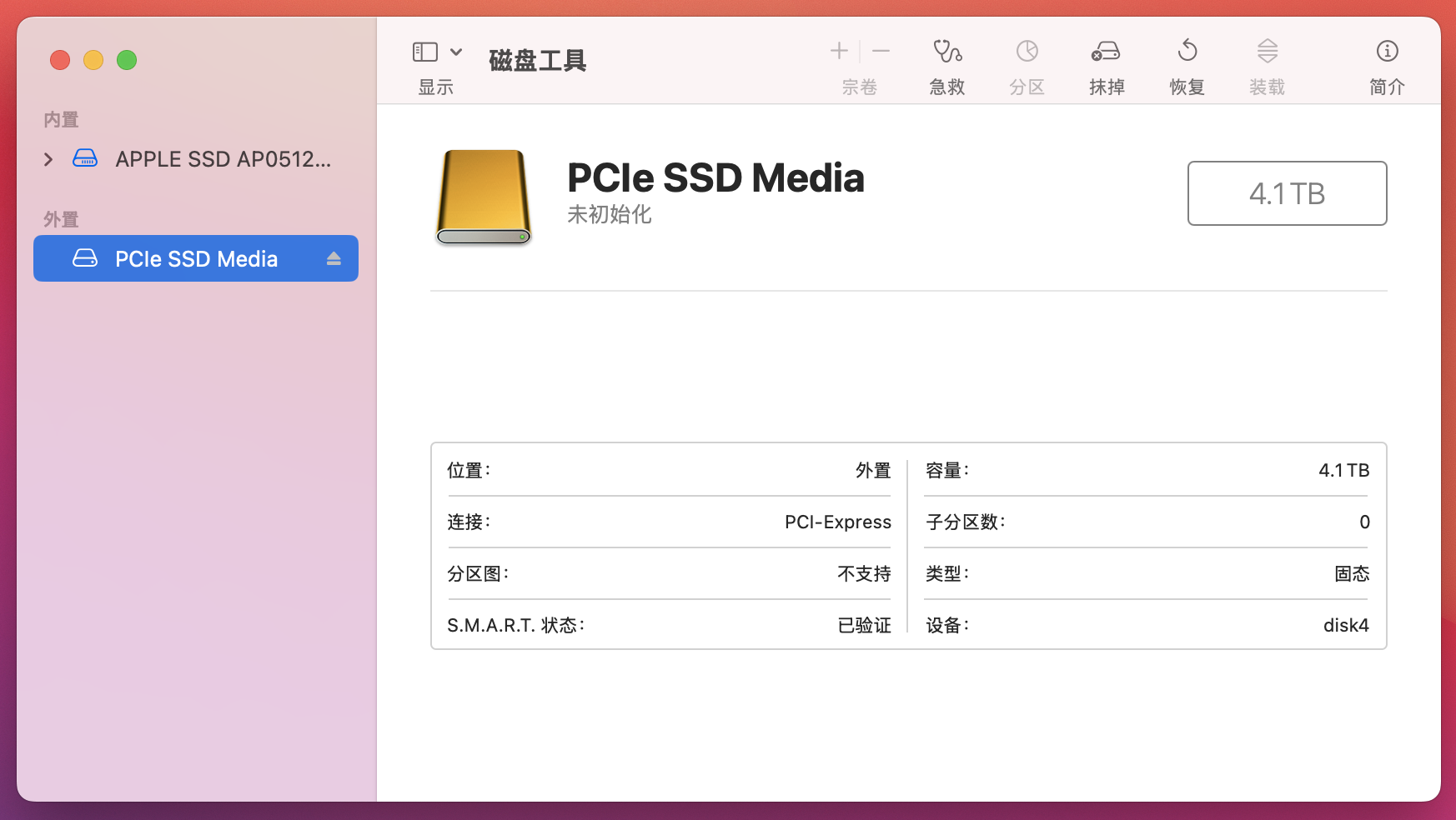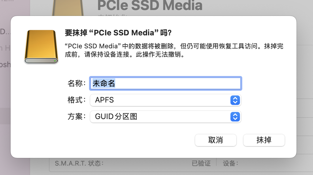 - 窗口左列中选择外置磁盘, 窗口顶栏中选择抹掉。