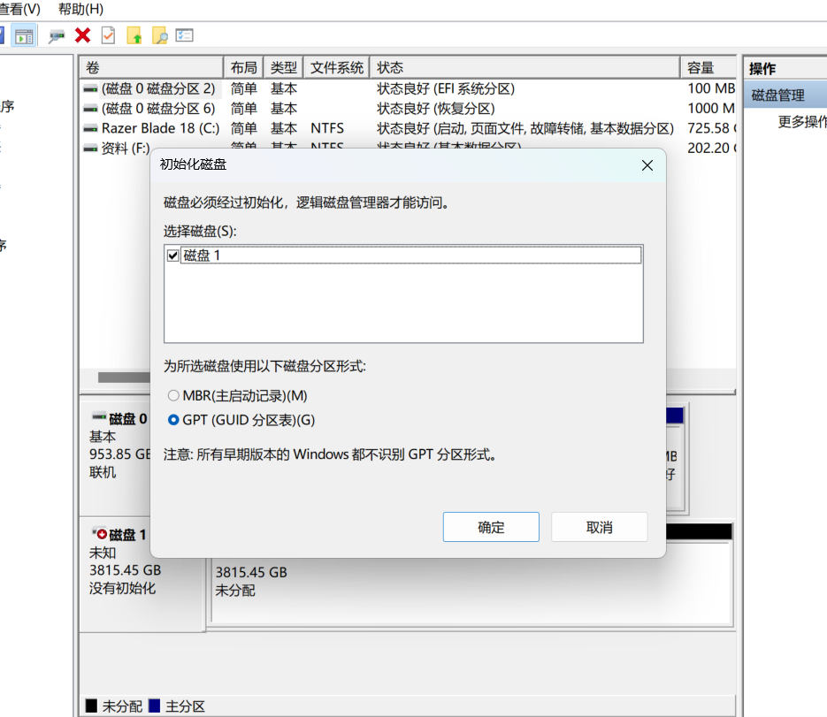 - 右击此电脑 图标,选择管理, 计算机窗口左边列表中选择存储, 选择磁盘管理, MBR(主启动记录)或GPT(GUIDE分区表)二选一, 点击确定。
