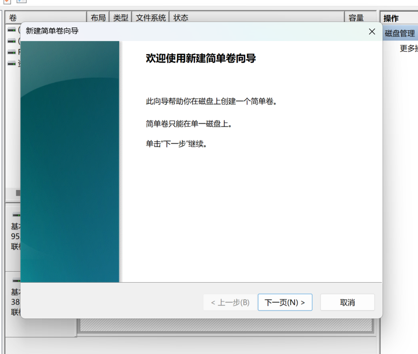 - 右击选中的磁盘, 选择新建简单卷,点击下一页。