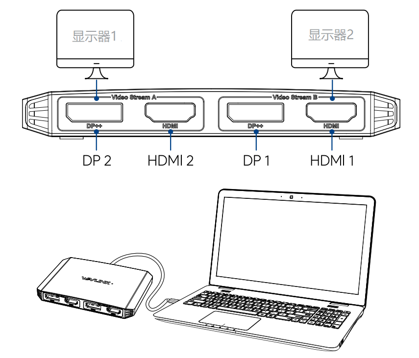 ②: 该适配器支持双显输出。将不同视频组的DP或HDMI接口连接至电视、投影仪或其他支持DP或HDMI接口的显示器。