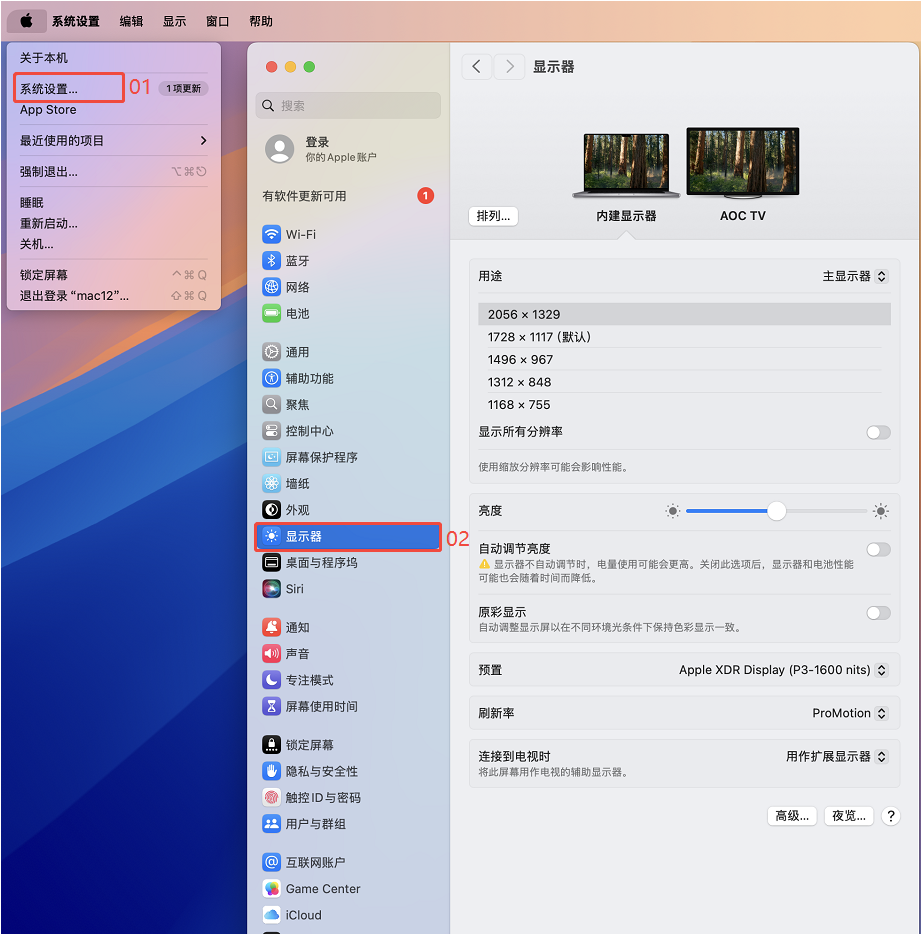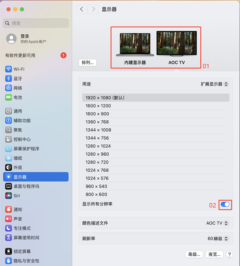 - 点击选择一个外接屏,再点击显示所有分辨率。
