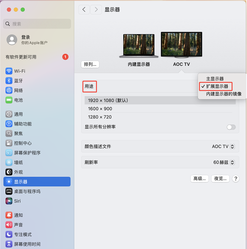 - 点击用途,选择扩展显示器。