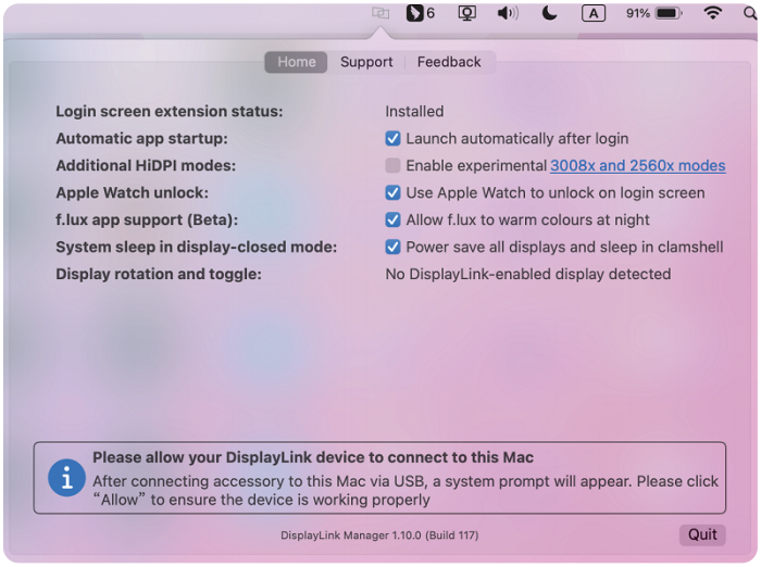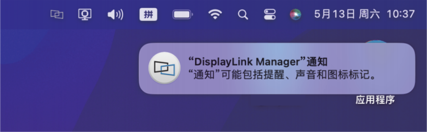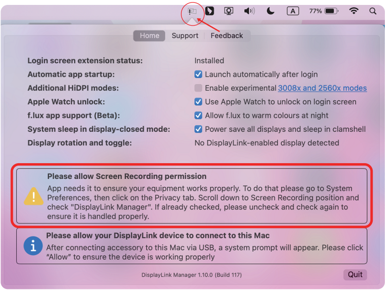 点击屏幕顶部右侧菜单栏中的DisplayLink Manager图标,确认屏幕录制弹窗是否消失,以及DisplayLink驱动是否可正常工作。