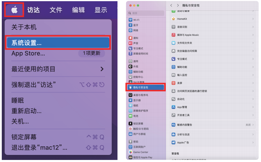 - 点击屏幕顶部左侧菜单 栏中的苹果图标,选择“系统设置”,双击“隐私与安全性”。