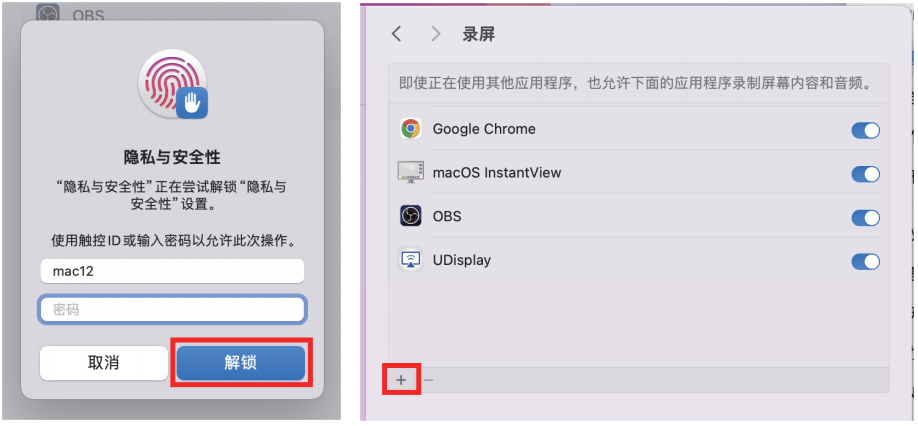 - 若DisplayLink Manager出现在右侧列表中,输入密码或指纹解锁后点击选中复选框打开即可;若DisplayLink Manager未出现在右侧列表中,单击左下角的“+”按钮添加它。