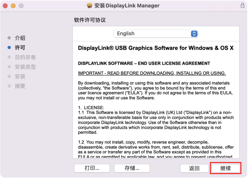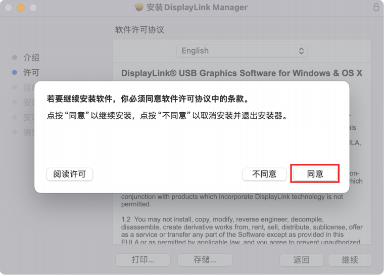 - 阅读许可协议后点击“继续”,弹窗中选择“同意”。