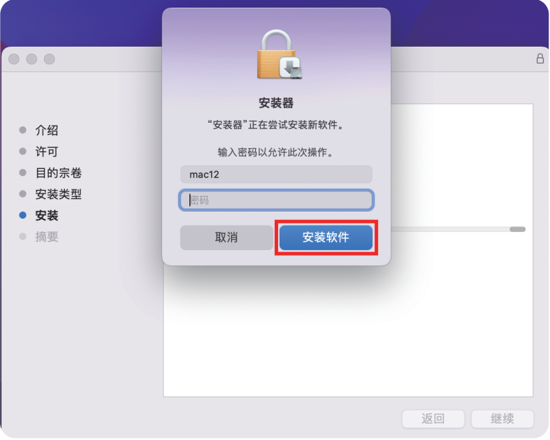 - 输入密码或指纹解锁后点击“安装软件”。