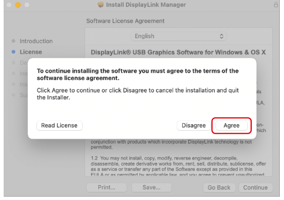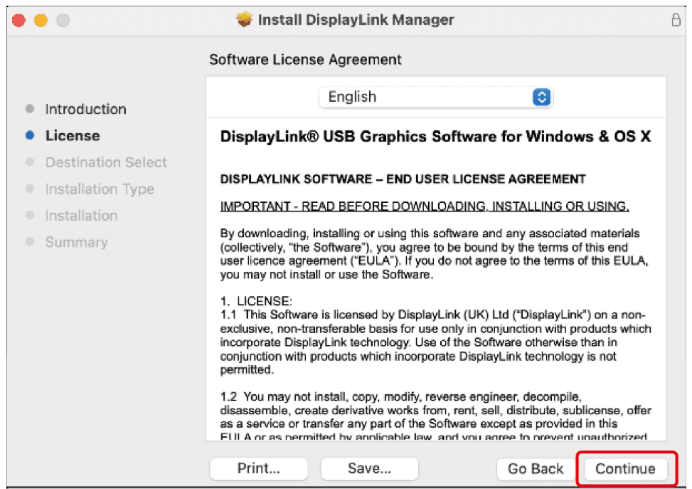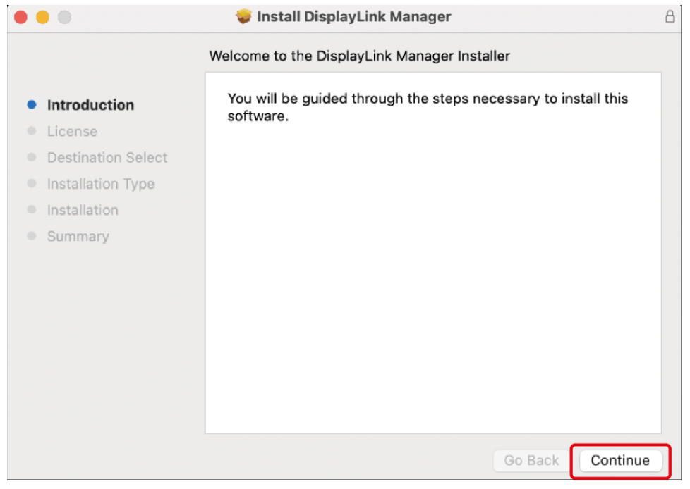 - Double-click the driver file you just downloaded, navigate to the Install DisplayLink Manager window, click Continue.