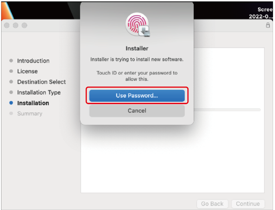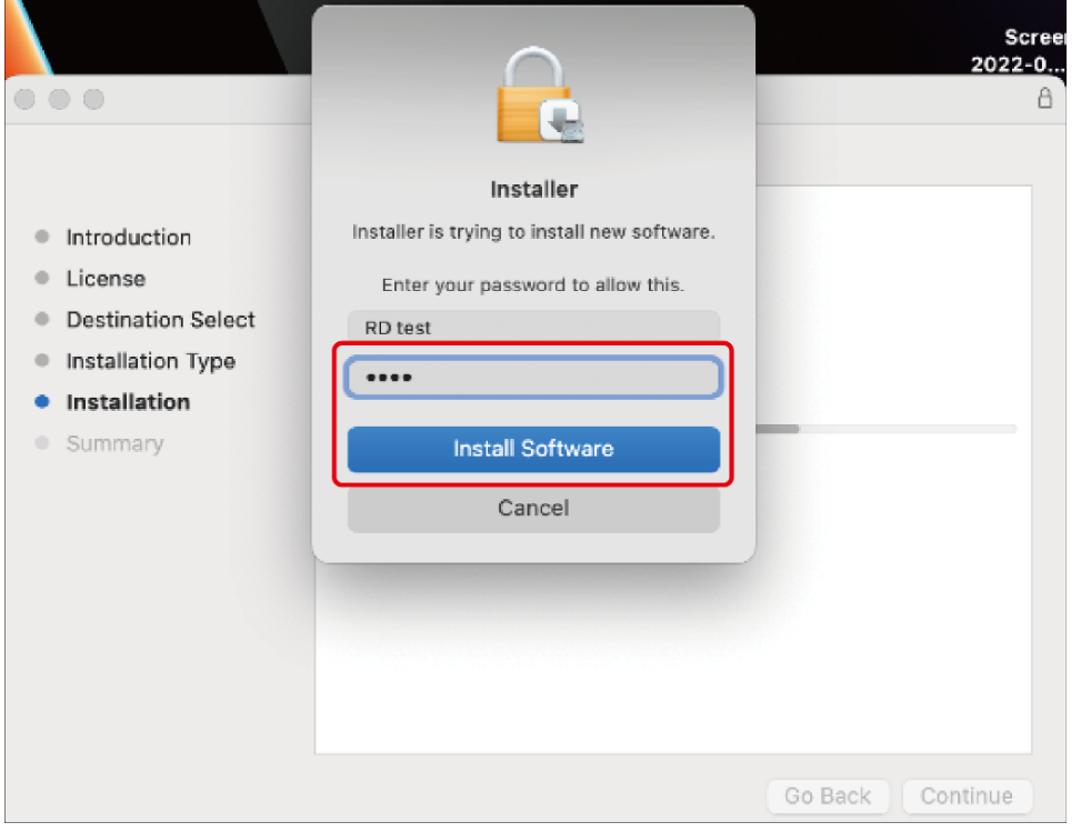 - Click Install and choose Use Password..., then enter the screen password and click Install Software.