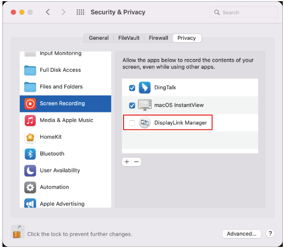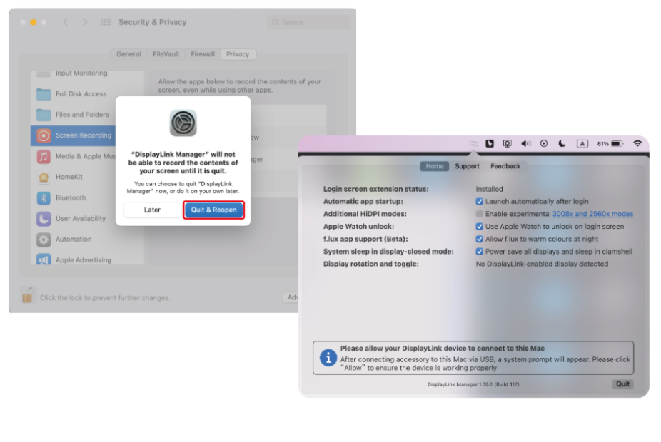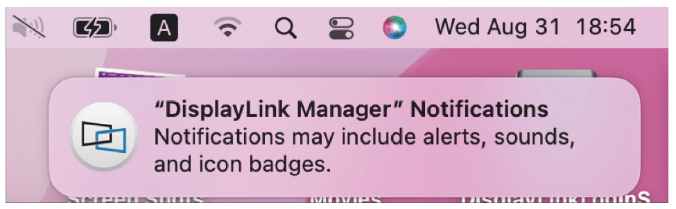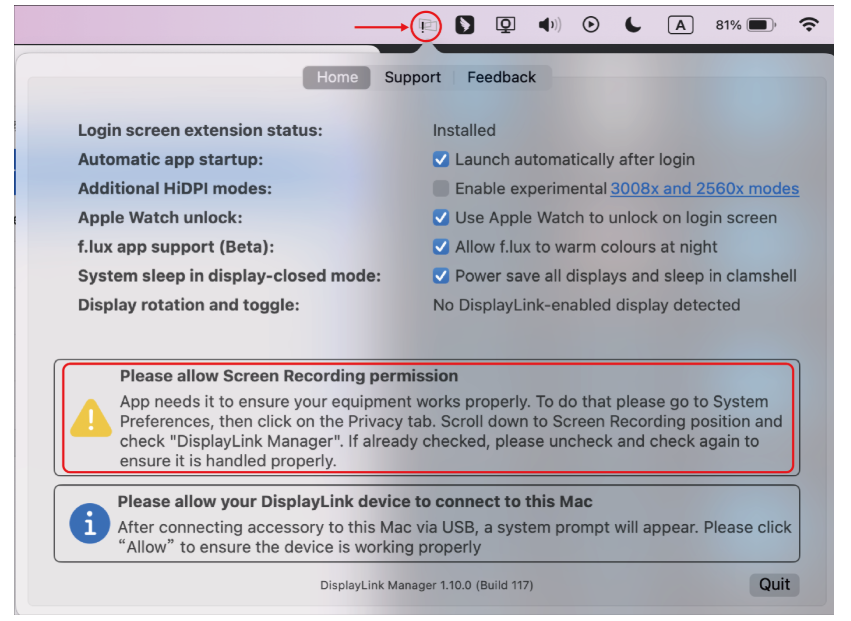 - If you have enabled notifications from DisplayLink Manager, it will remind you to allow screen recording when it detects that this permission is missing.