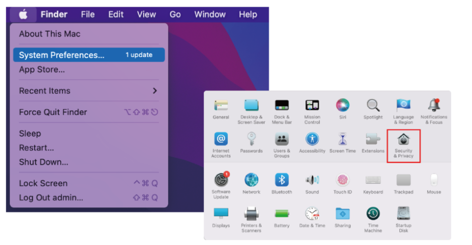 - Click the Apple icon → System Preferences, then double click Security & Privacy.