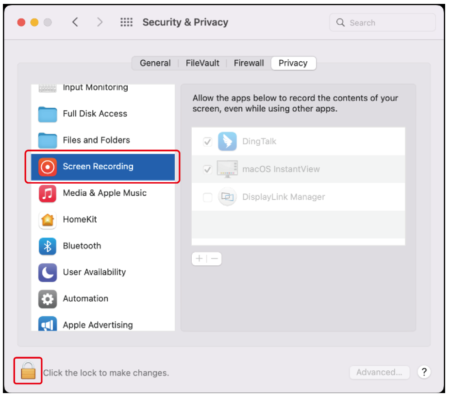 - Enable Screen Recording to allow the DisplayLink Manager application to capture pixels and send them to your USB peripheral: