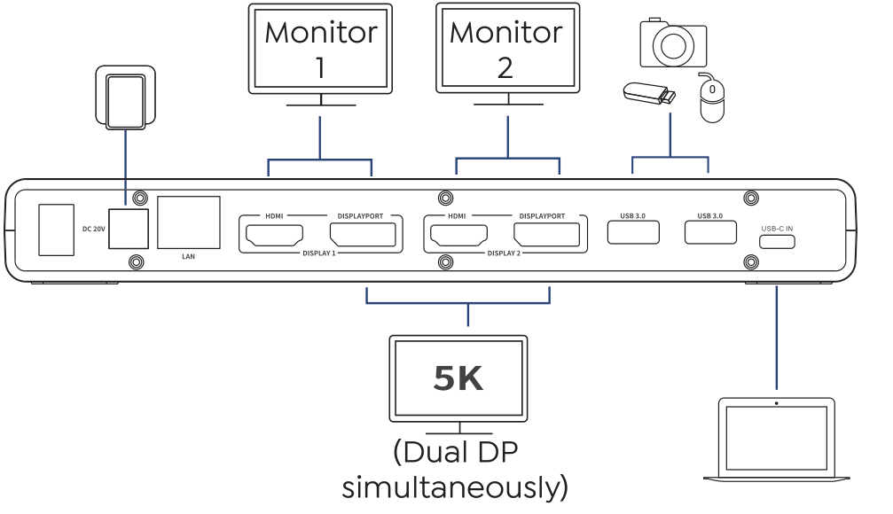 - Supports 5K on two displays at the same time via dual DisplayPort.