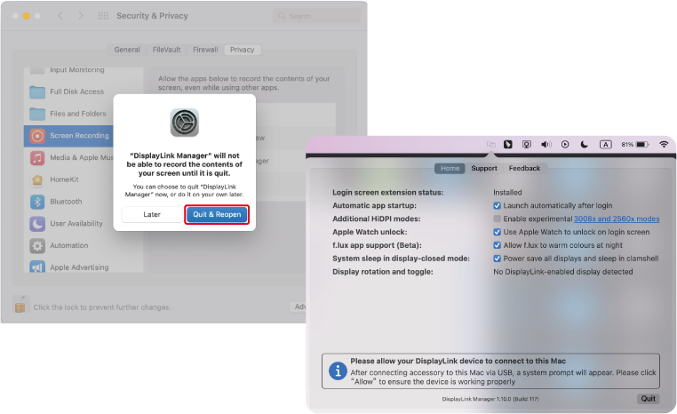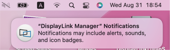 - lf you have enabled notifications from DisplayLink Manager, it will remind you to allow screen recording when it detects that this permission is missing.