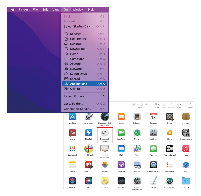 - lf you didn't get the notification from DisplayLink Manager, please click Go in the function bar at the top left of screen, then select Applications and click DisplayLink Manager.