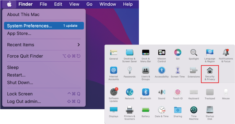 - Click the Apple icon and select System Preferences, then double click Security & Privacy.