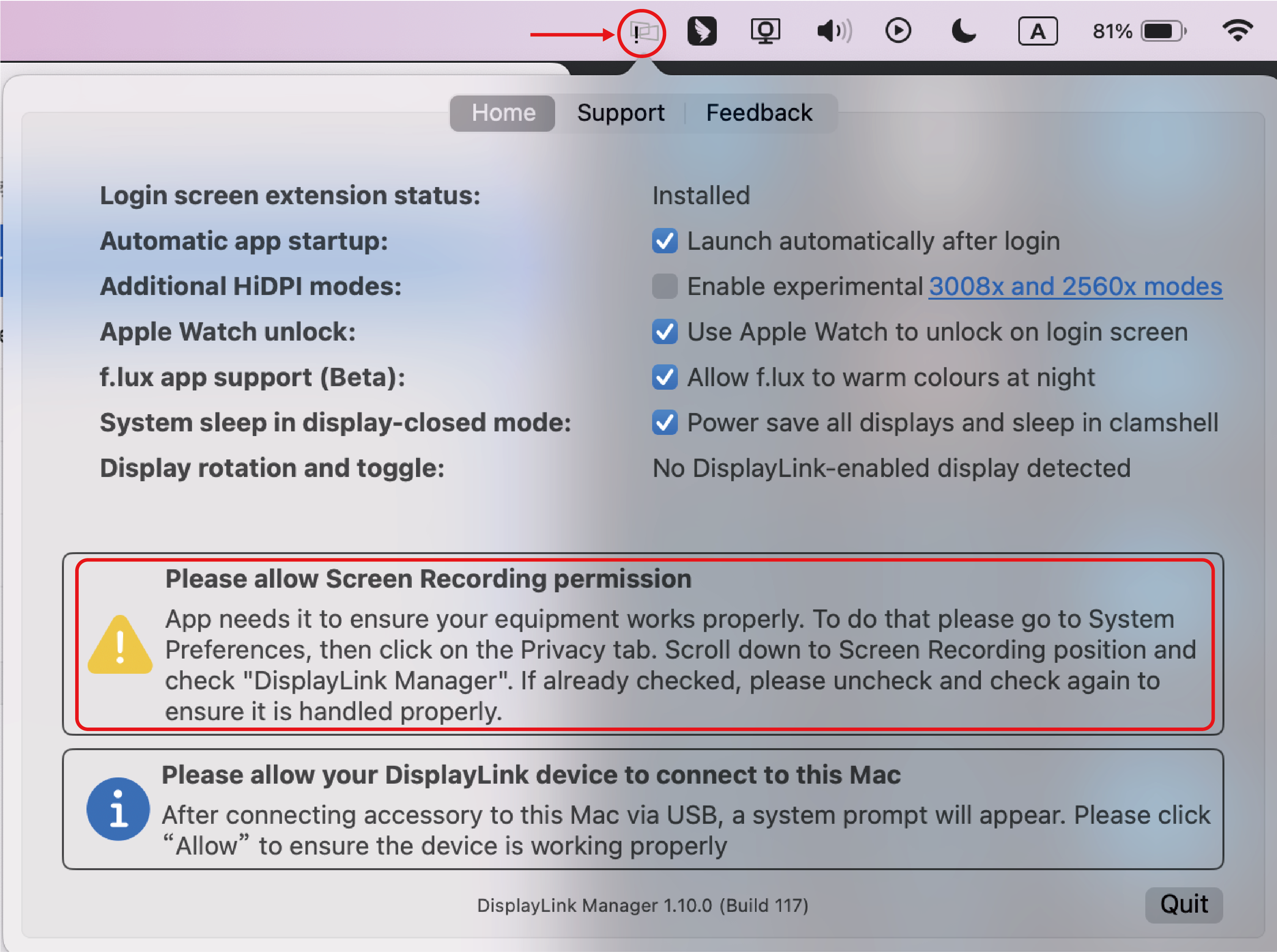- Click the DisplayLink Graphics icon in the funcion bar at the top right of the screen, and the notification will also appear in the DisplayLink Manager window. A warning is found here, you should allow the screen recording permission for DisplayLink Manager.