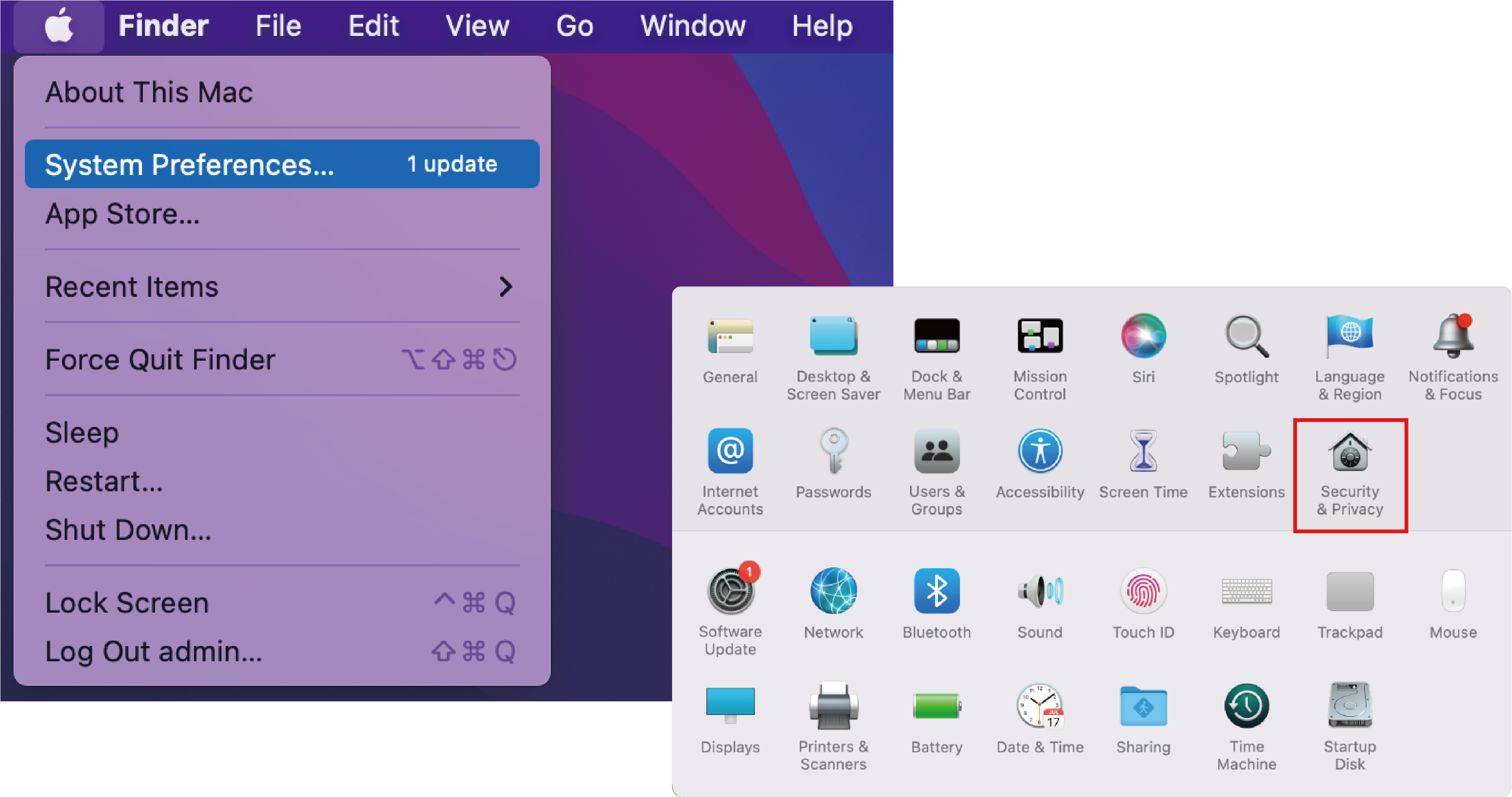 - Click the Apple icon→ System Preferences, then double click Security & Privacy.