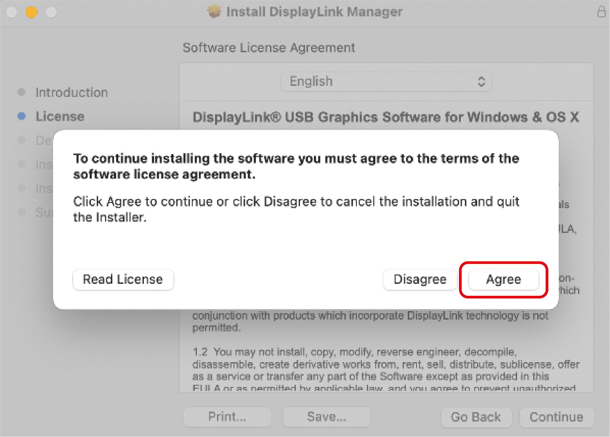- Double-click the driver file you just downloaded, navigate to the Install DisplayLink Manager window, click Continue.