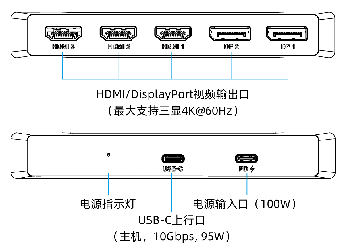 - 一个USB-C上行口兼容雷电5/4/3和全功能USB4/3.2/3.1/3.0/2.0 Type-C/Type-A主机,数据传输速度可达10Gbps,USB-C主机充电可达95W。