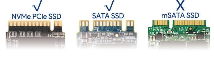 To ensure proper SSD operation, first select a compatible SSD type. This device supports both PCIe and SATA SSDs. Refer to the following image for reference: