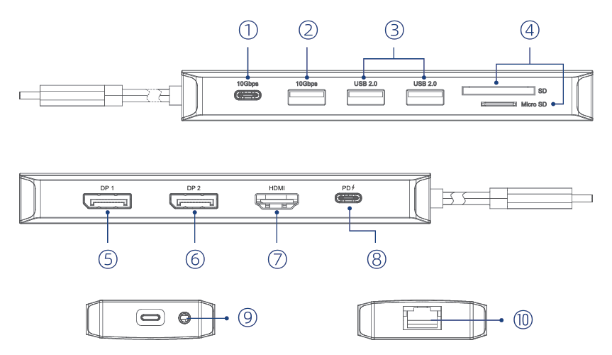 2. HDMI and DP Ports: Only can be used when the USB-C port of your host device(laptop/smartphone/tablet) can output video.