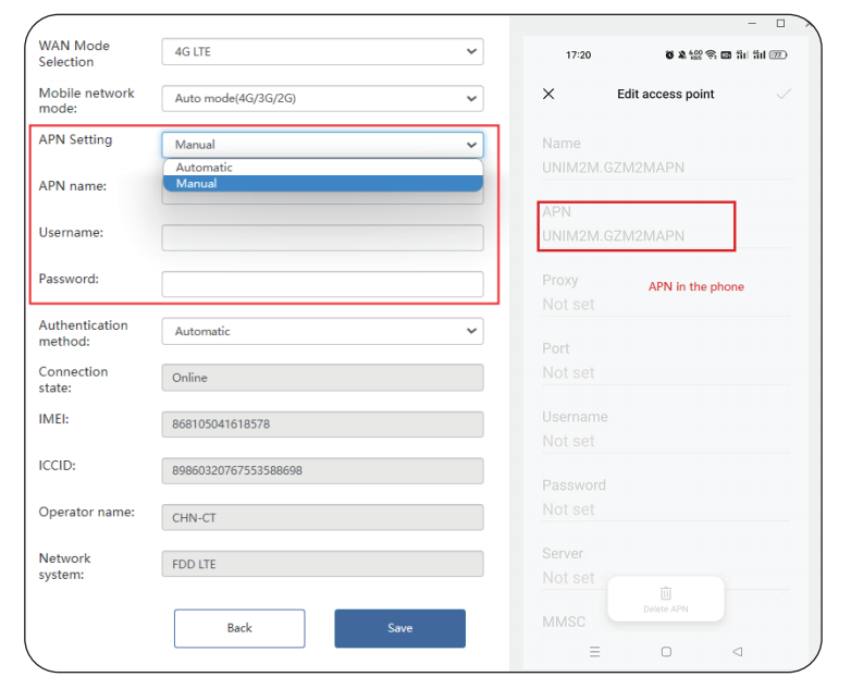 - Get the APN (Access Point Name) settings from your Mobile Service Provider or insert the same SIM card into your phone and find APN settings from phone. Then log into the web-base setup page of the router and select MANUAL to manually enter APN Settings, including APN Name, User Name, Password, and Authorization information.