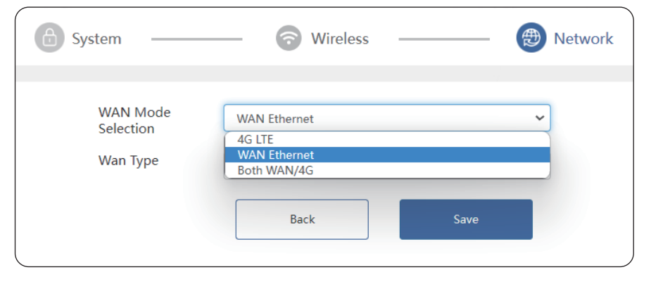 - 3.6 At the Network page, Choose WAN Ethernet for WAN Mode Selection, and Select DHCP/Static IP/PPPoE for WAN(Ethernet) Type.